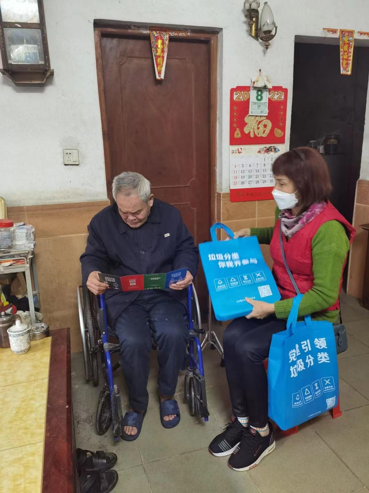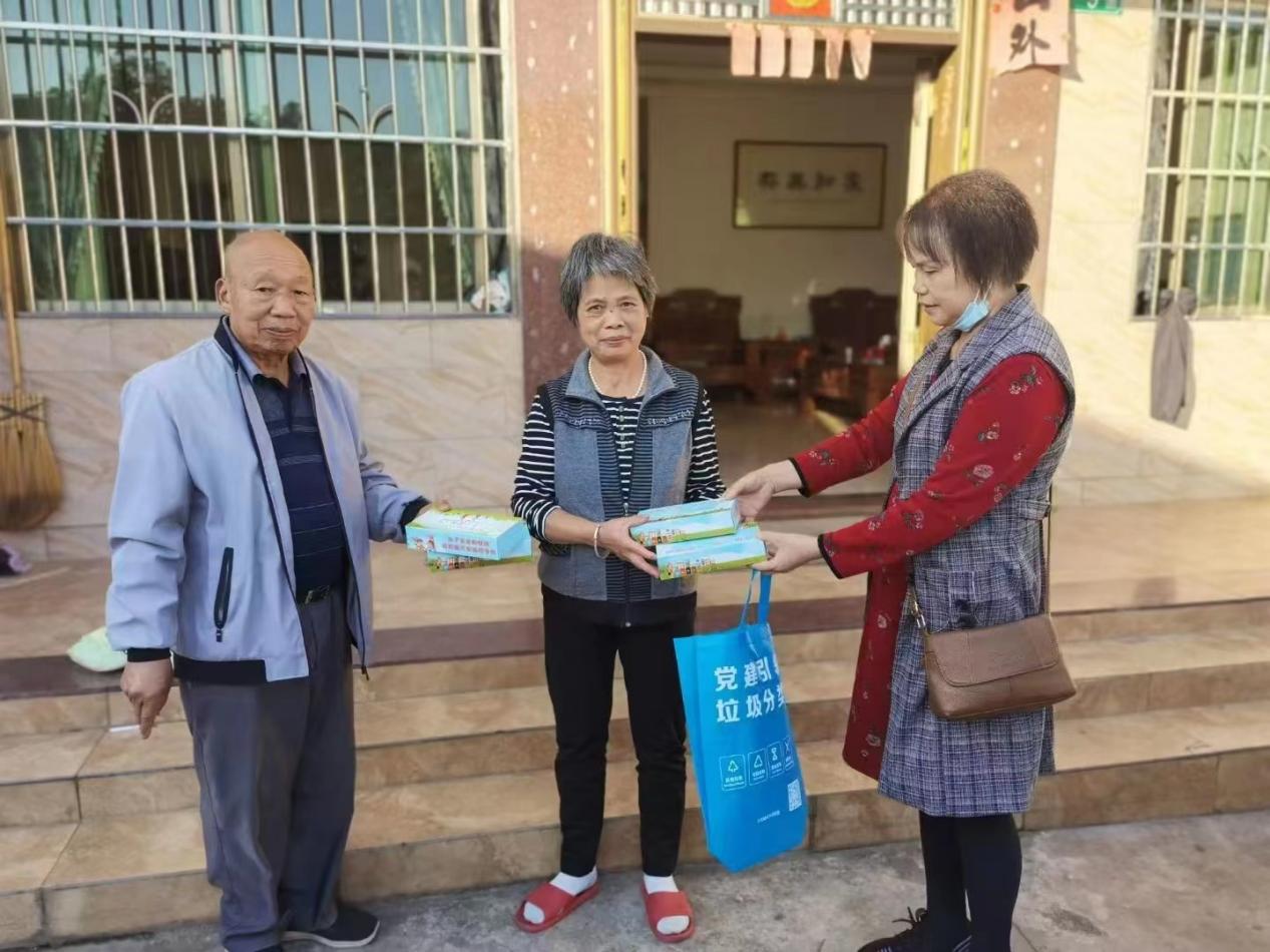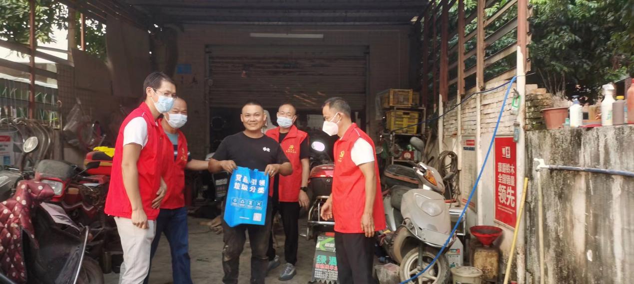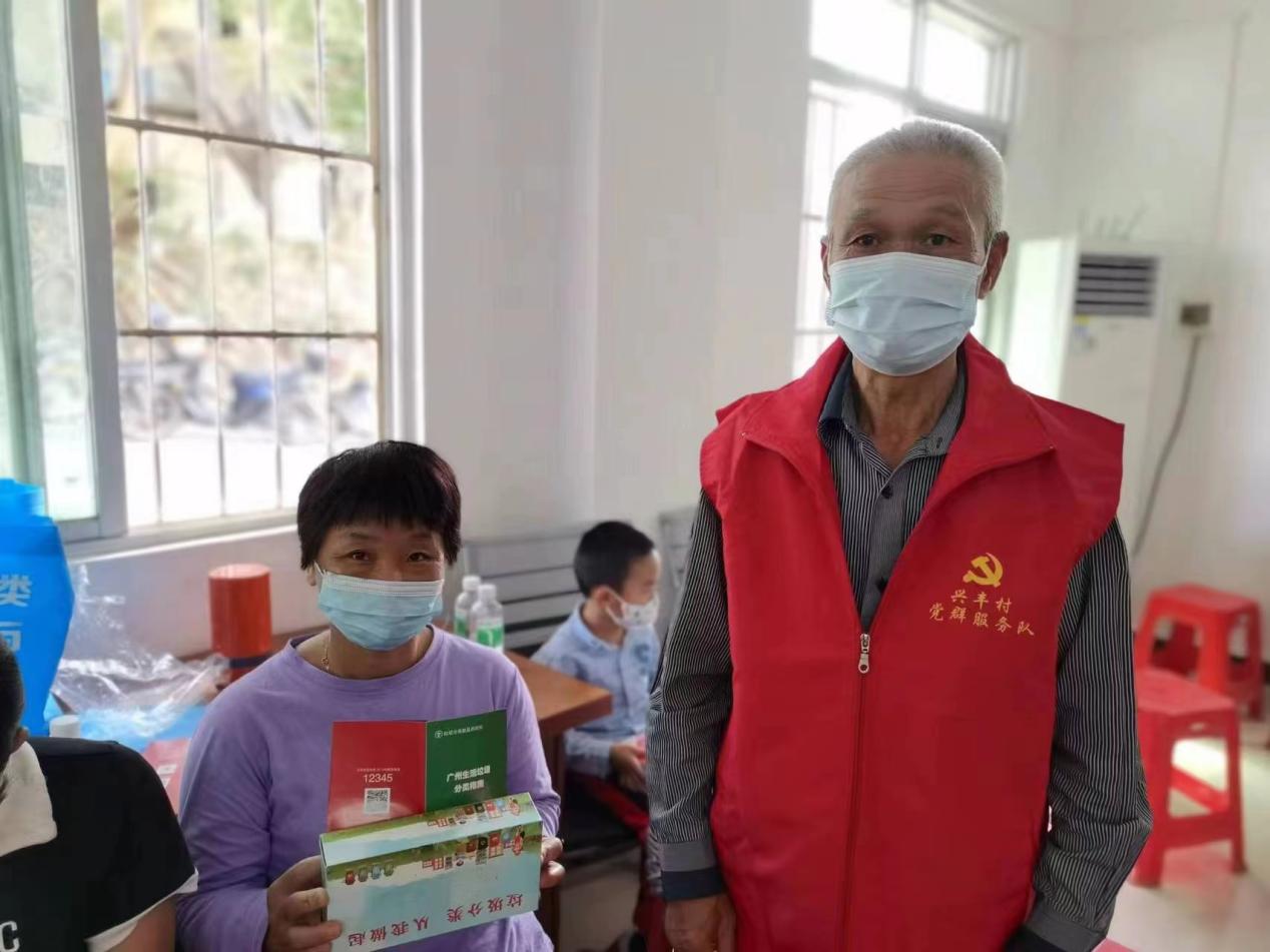 党员、志愿者的身影穿梭在兴丰村辖区内,挨家挨户地进行垃圾分类入户宣传。党员、志愿者走进每一户村民的家门,为他们发放《广州市生活垃圾分类宣传指南》、生活垃圾宣传纸巾、环保袋并详细讲解垃圾分类的重要性、分类标准和正确分类技巧。