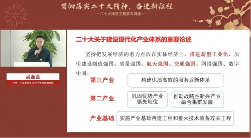 本次讲座邀请中共广东省委党校经济学教研部副主任、副教授,深圳市创新投资集团与清华大学博士后吴圣金。吴教授以《“贯彻落实二十大精神,奋进新征程”二十大经济主题学习》为主题,围绕理解二十大报告所勾画的未来方向开展,聚焦二十大报告中对经济工作方面的部署做重点解读。讲座内容视野开阔、重点突出、分析透彻,具有很强的思想性、理论性和指导性,对学习理解党的二十大精神的重大现实意义和深远历史意义、凝聚共识、强化担当有着重要作用。