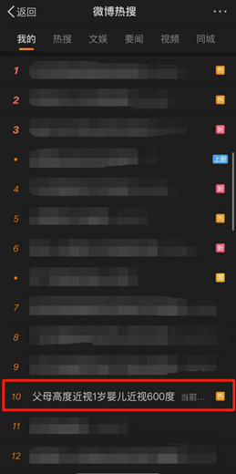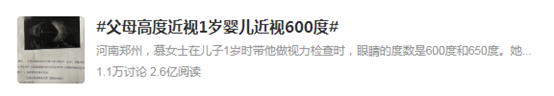 2月16日,一则“父母高度近视1岁婴儿近视600度”的消息一经发出迅速冲上热搜,话题阅读量高达2.6亿,引发网友热议。