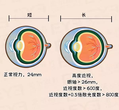 而病理性近视就恰恰相反,它是真正的眼病。病理性近视不仅会在成年之后继续加深近视度数,且伴有眼轴不断过度增长(>26.5mm)以及不可逆的视觉损害和眼底病变。因此,一旦发现自己在成年之后还有度数增长的情况,应及时到专业的眼科医院检查是否出现病理性近视以及其他疾病,同时做好防控,把对下一代的影响降至最低。