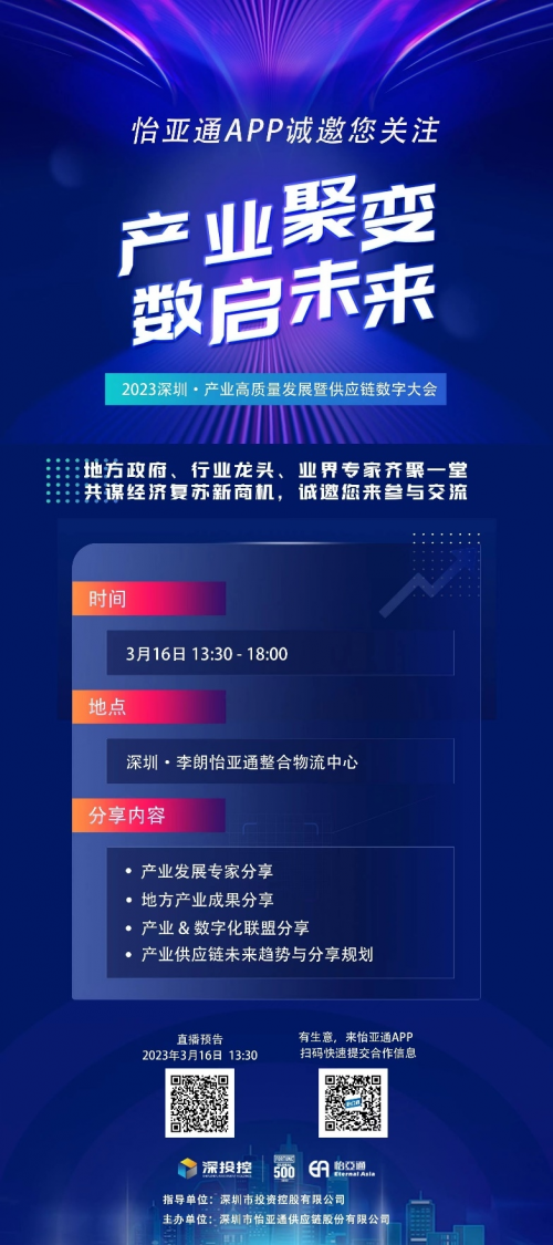 3月16日,2023深圳·产业高质量发展暨供应链数字大会将在深圳召开。怡亚通集团董事长和各行各业的精英大咖共同出席现场,为大家带来一场产业数字化转型升级的实战盛宴!