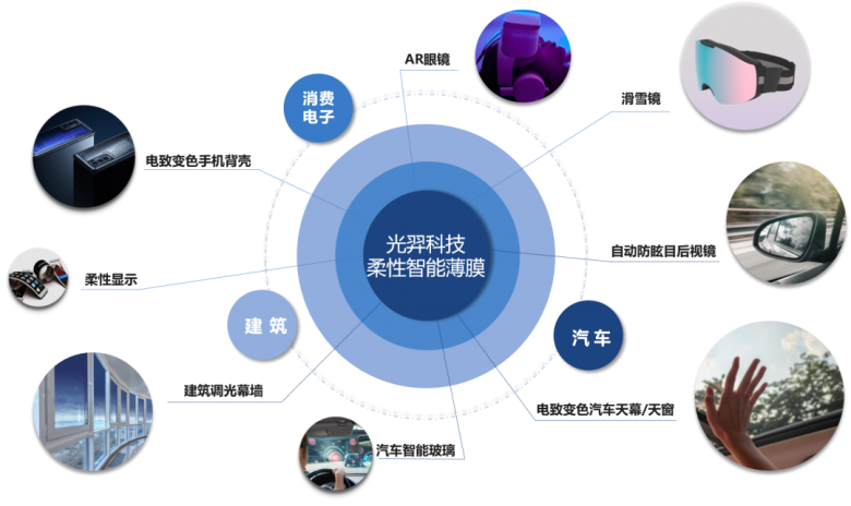 基于电致变色技术核心的创新,光羿科技把产品形态的创新延伸到了消费电子、汽车和建筑等众多全新应用领域,这些创新产品包括手机变色背壳、滑雪镜、AR眼镜、汽车智能调光天幕/侧窗以及建筑幕墙等。众多电致变色产品产品从无到有、从小尺寸到大尺寸、从小众产品渐渐一步步走入大众视野。