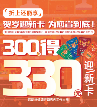 为激发消费活力,华润万家特别推出龙年迎新卡,龙腾虎跃、龙行大运、龙马精神、祥龙贺岁四款龙年好运卡,展示了对新年的美好祝福。购300元贺岁迎新卡得330元,活动期间享受品类折扣优惠后还能叠加使用,四舍五入相当于4.5折,一省再省。